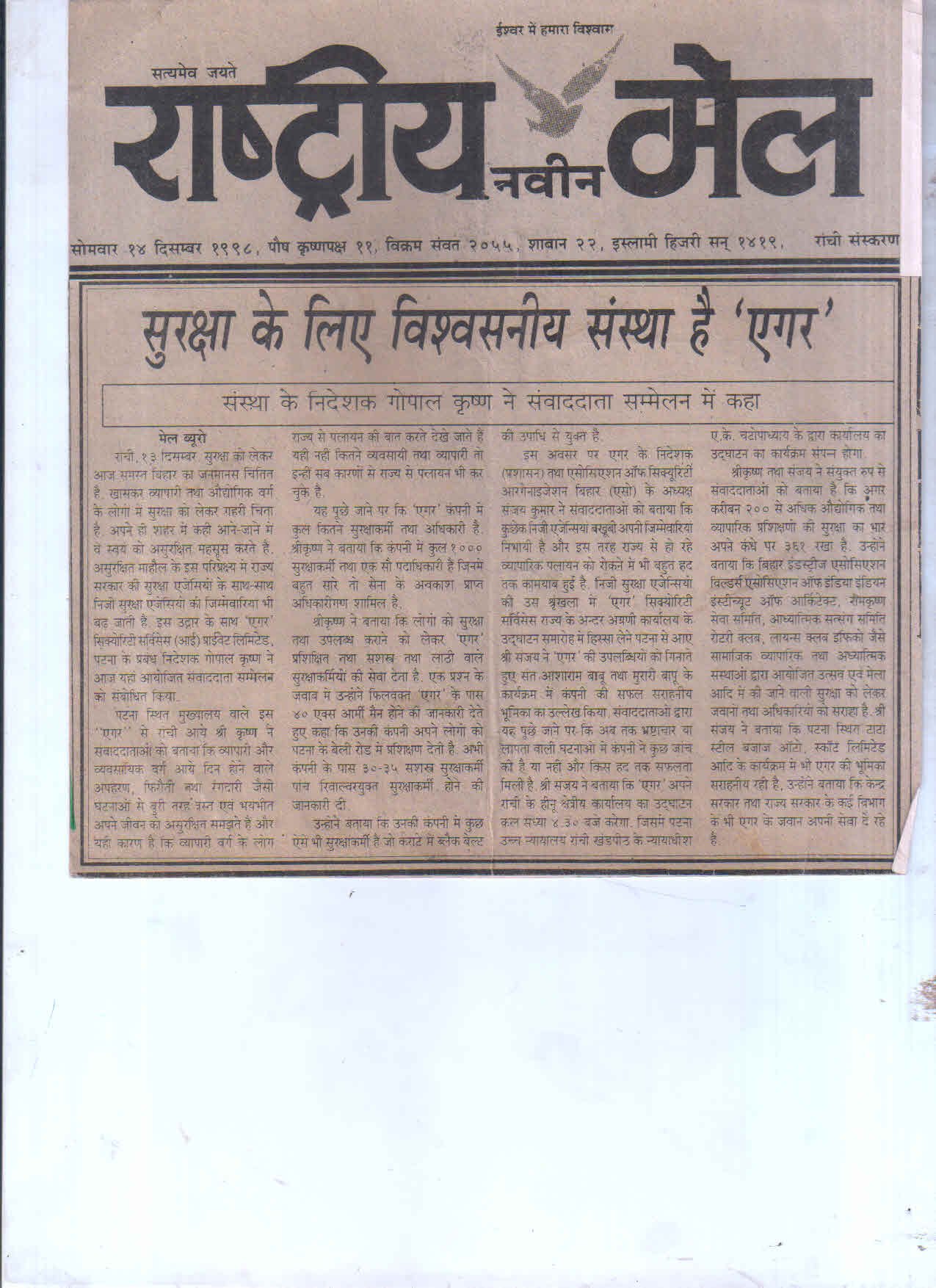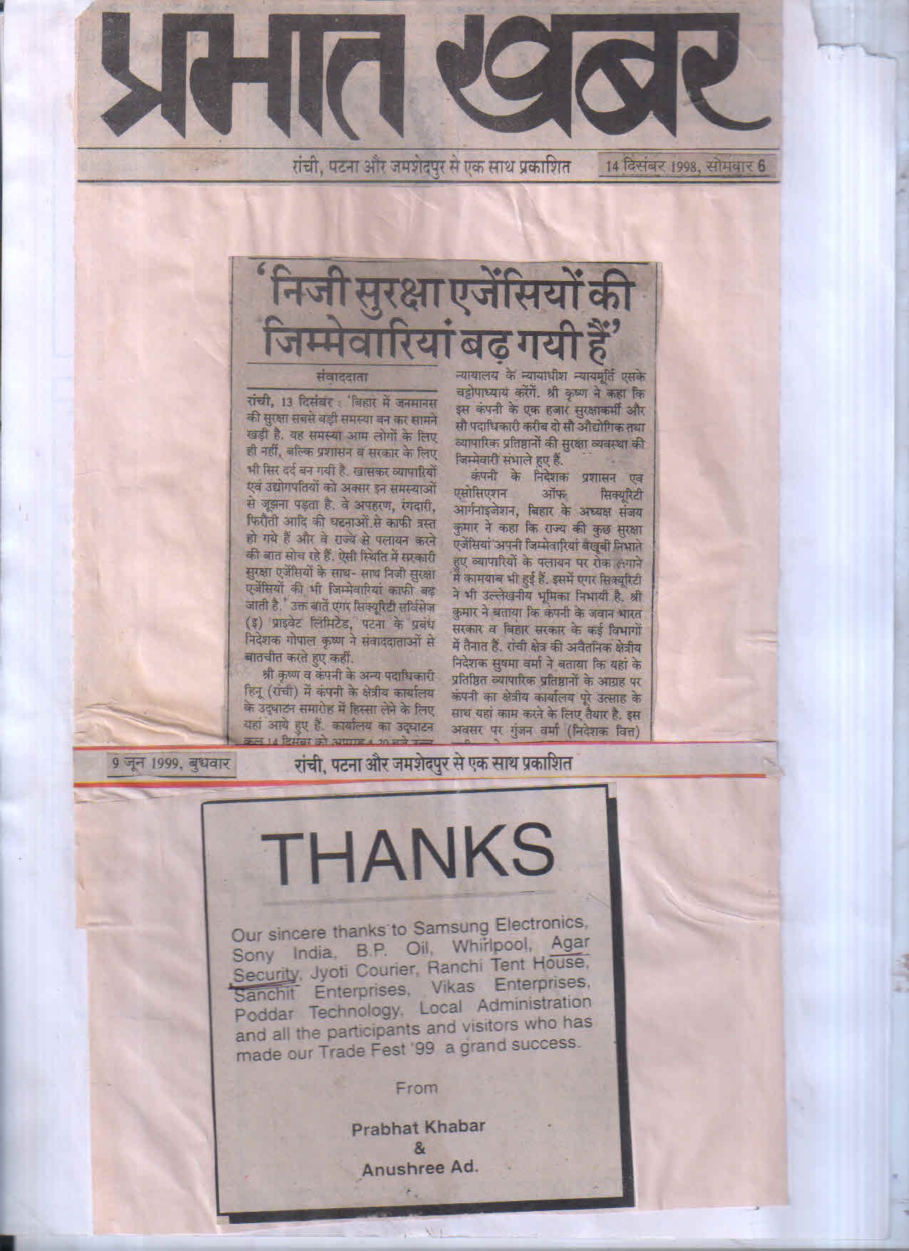 Since its inception in 1992, Aggar Security Services(I) pvt.ltd has consistently demonstrated an unwavering dedication to the safety and security of people. Over the years, numerous news articles and reports have highlighted the company's proactive security measures and quick responses in critical situations, underscoring its commitment to protecting lives and property. Aggar Security Services (I) pvt.ltd has established itself as a leader in the industry through innovative security solutions, community outreach initiatives, and partnerships that enhance public safety. This steadfast focus on professionalism and reliability has earned the trust of clients and stakeholders alike, reinforcing the company's reputation as a dependable provider of comprehensive security services. Our journey has been well-documented in newspapers and articles, reflecting our long-standing commitment to excellence. As Aggar Security Services (I) pvt.ltd continues to evolve and adapt to emerging threats and challenges, our dedication remains steadfast. We are committed to upholding the highest standards in safeguarding the well-being of the individuals and communities we serve, ensuring a secure and safe environment for all.