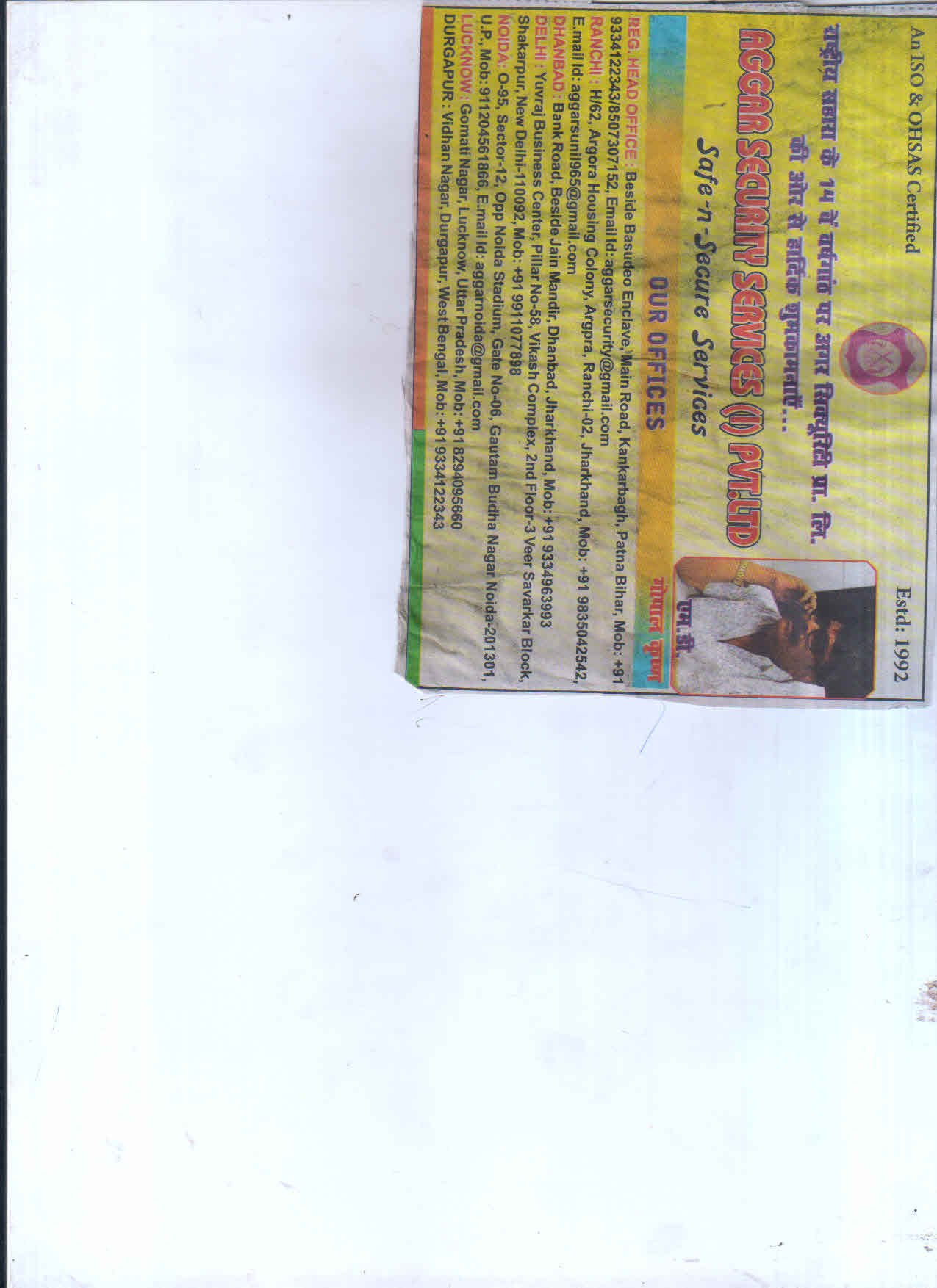 Since its inception in 1992, Aggar Security Services(I) pvt.ltd has consistently demonstrated an unwavering dedication to the safety and security of people. Over the years, numerous news articles and reports have highlighted the company's proactive security measures and quick responses in critical situations, underscoring its commitment to protecting lives and property. Aggar Security Services (I) pvt.ltd has established itself as a leader in the industry through innovative security solutions, community outreach initiatives, and partnerships that enhance public safety. This steadfast focus on professionalism and reliability has earned the trust of clients and stakeholders alike, reinforcing the company's reputation as a dependable provider of comprehensive security services. Our journey has been well-documented in newspapers and articles, reflecting our long-standing commitment to excellence. As Aggar Security Services (I) pvt.ltd continues to evolve and adapt to emerging threats and challenges, our dedication remains steadfast. We are committed to upholding the highest standards in safeguarding the well-being of the individuals and communities we serve, ensuring a secure and safe environment for all.